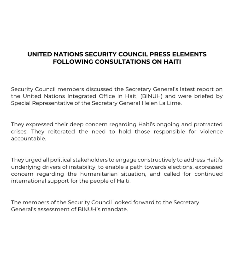 En seguimiento a las consultas realizadas sobre la situación en Haití, el Consejo de Seguridad de Naciones Unidas emitó un comunicado de elementos a la prensa.